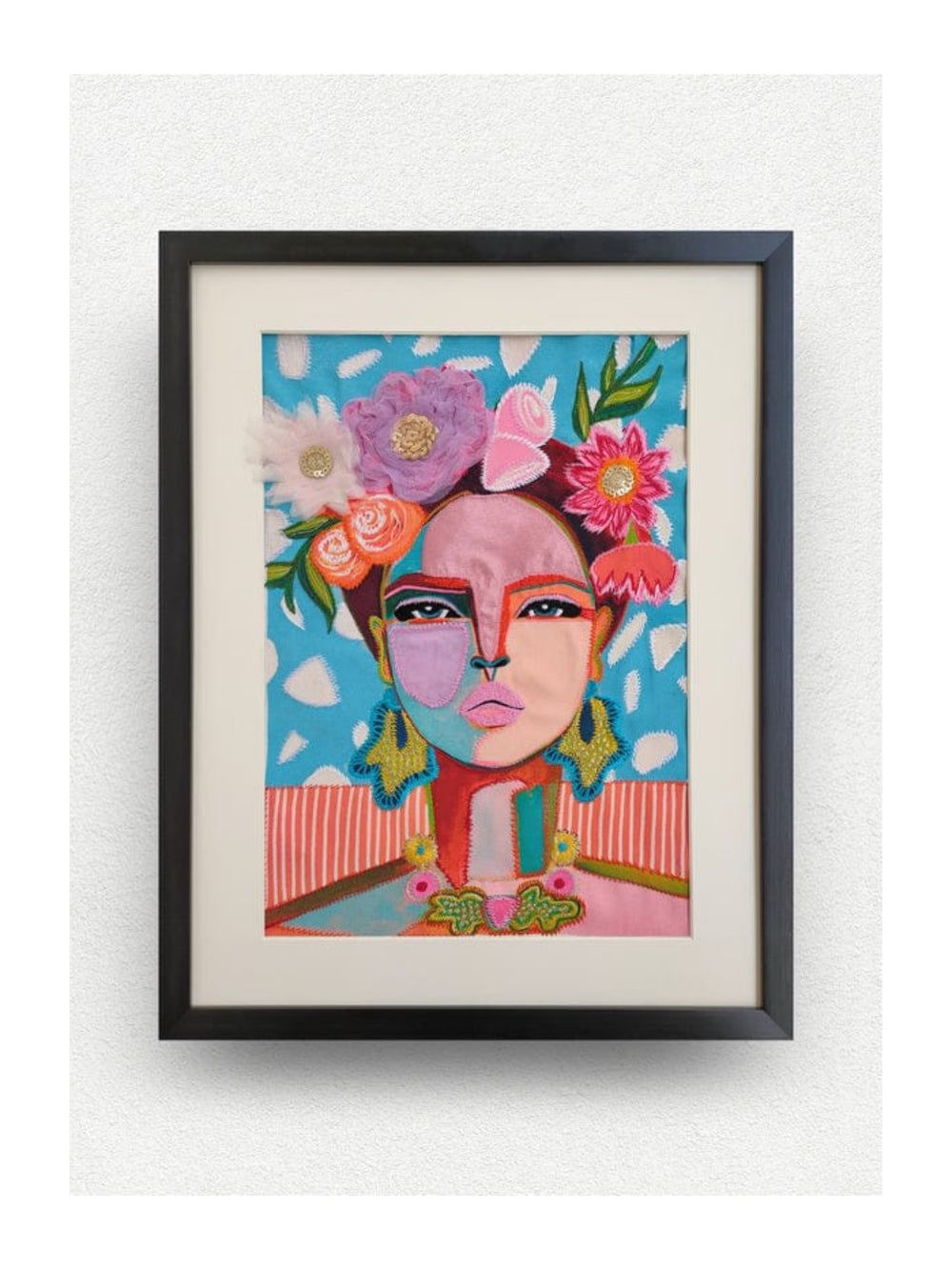 "TRIBUTE TO FRIDA KAHLO" Floral Art and Embroidered Canvas Frame
