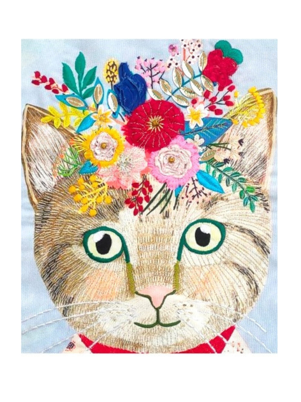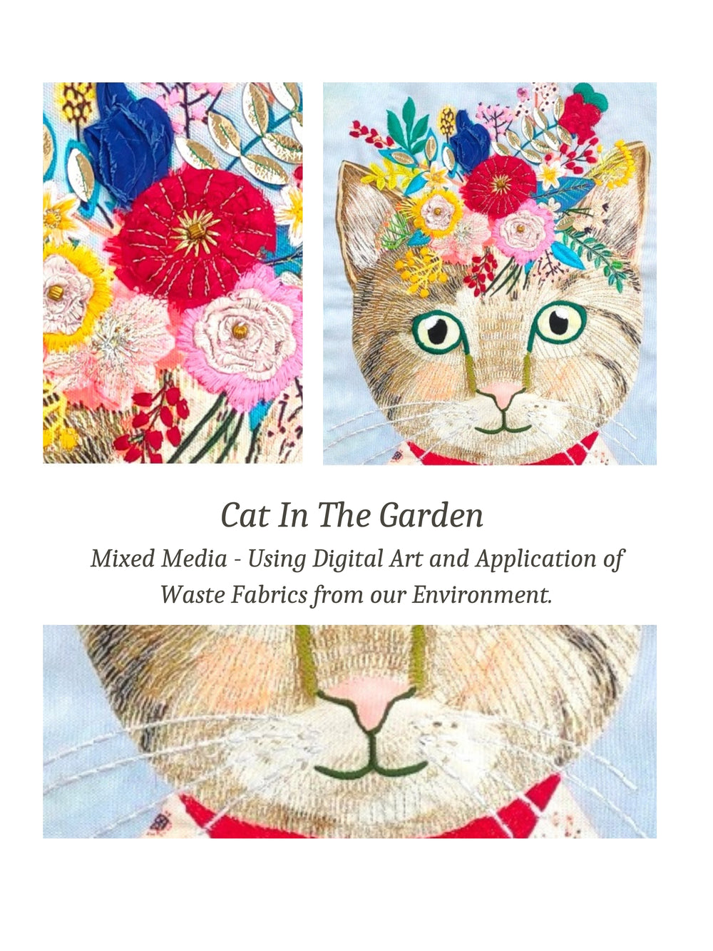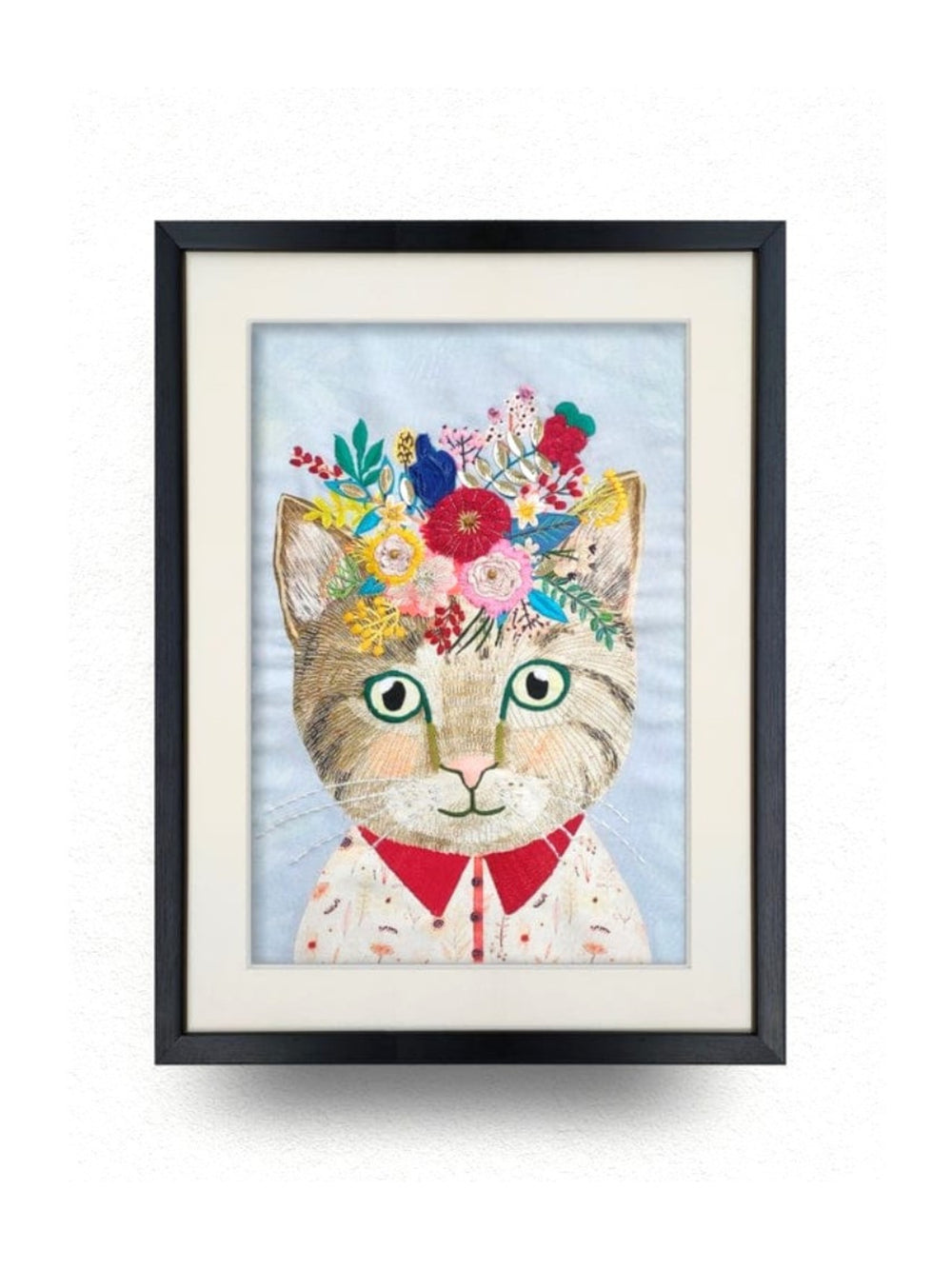 "Cat in the Garden" Floral Art and Embroidered Canvas Frame