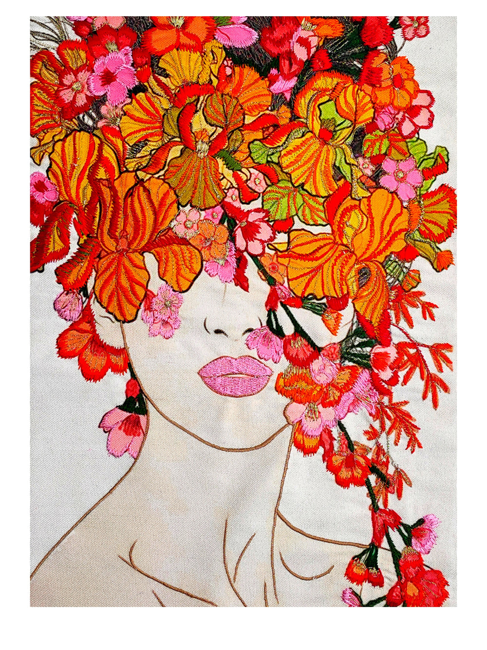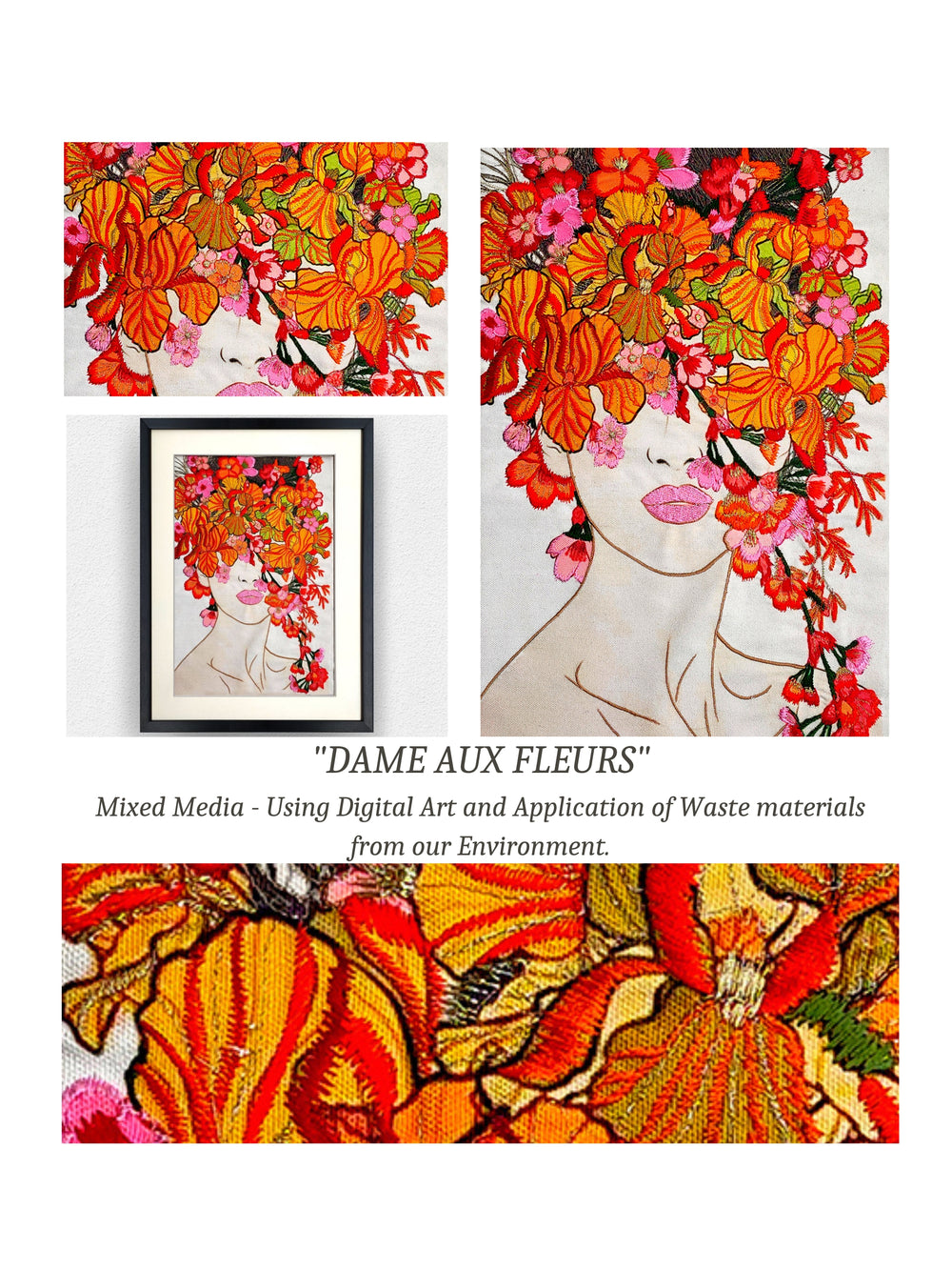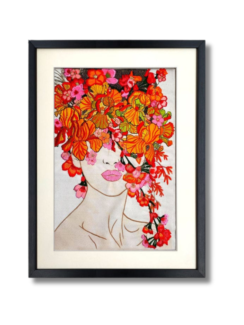 "DAME AUX FLEURS" Floral Art and Embroidered Canvas Frame
