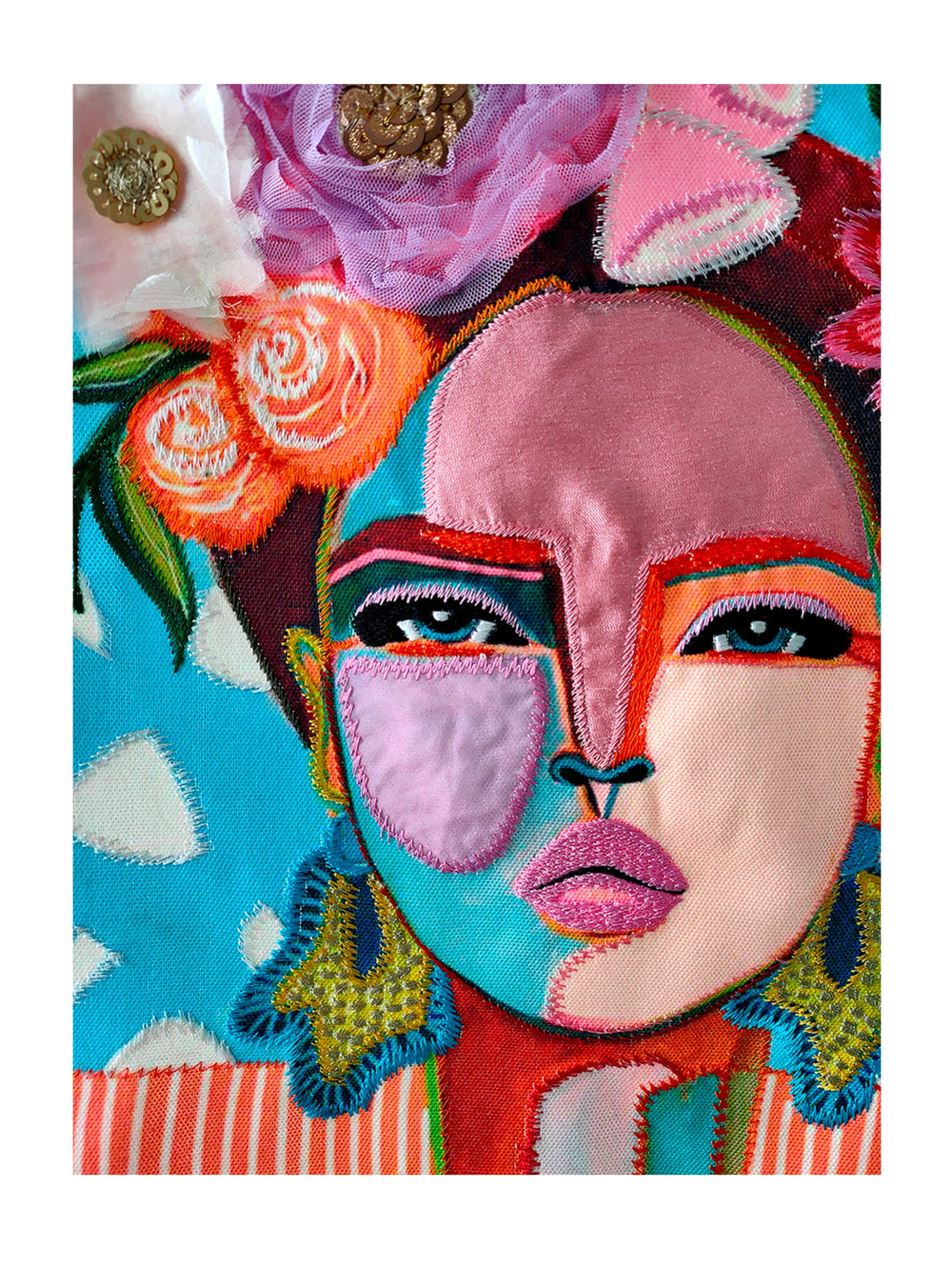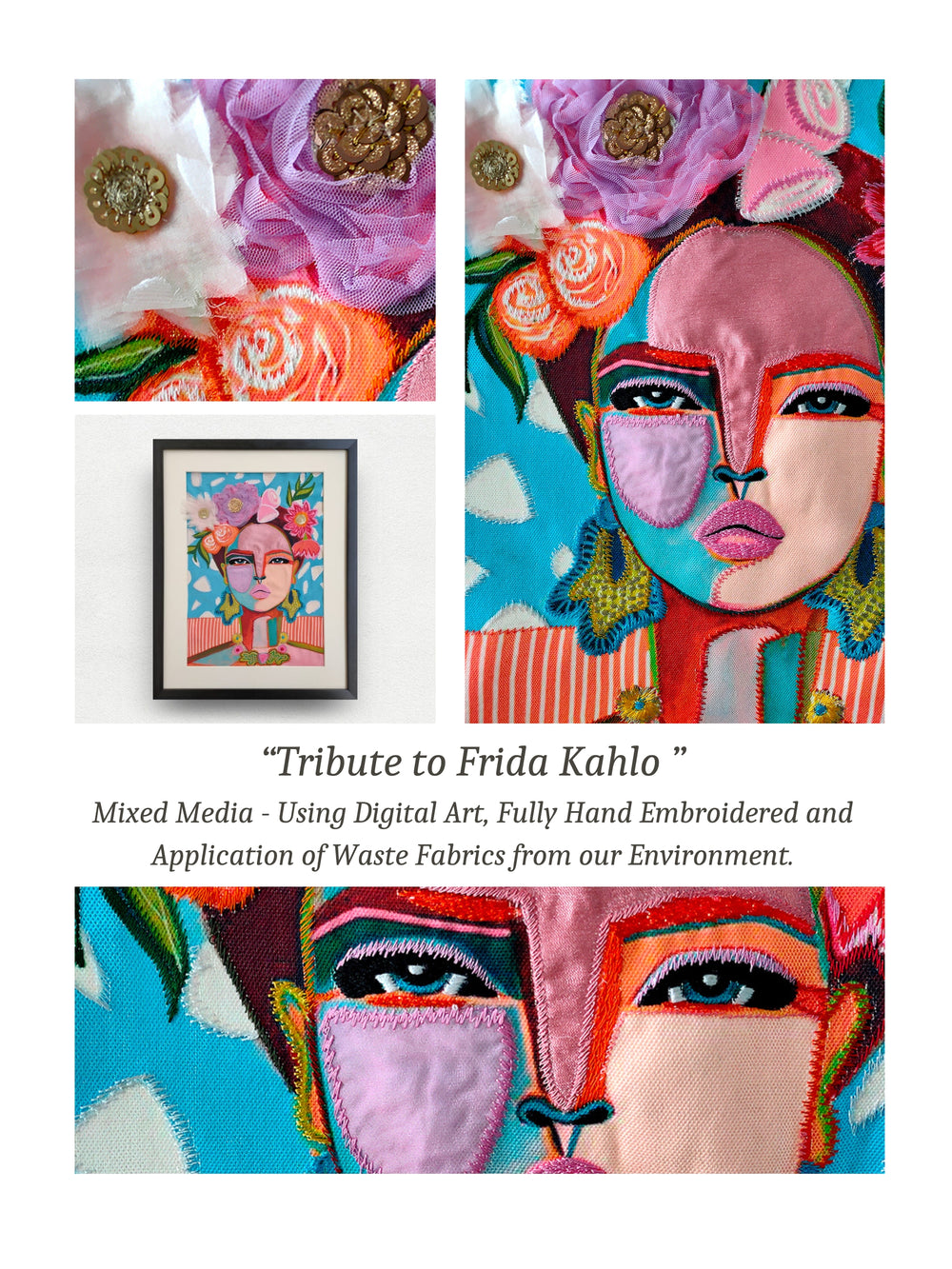 "TRIBUTE TO FRIDA KAHLO" Floral Art and Embroidered Canvas Frame